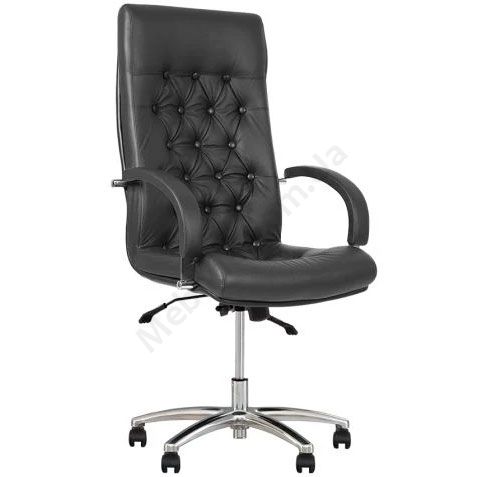 Крісло для керівника з ромбовидною прошивкою з ґудзиками, м’якими підлокітниками, фіксацією у будь-якому положенні, на алюмінієвій основі.