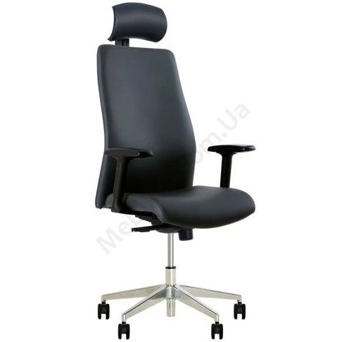 Крісло для керівника в лаконічному стилі, пластиковими регульованими підлокітниками, регульованим підголівником, фіксацією у 4 положеннях, на алюмінієвій основі.