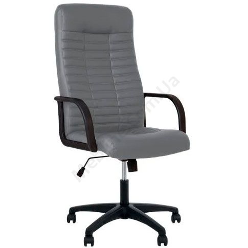 Крісло для керівника з високою спинкою та інтегрованим підголівником, роздільним каркасом, пластиковим нерегульованими підлокітниками, фіксацією у вертикальному положенні, на металевій основі з пластиковими накладками.
