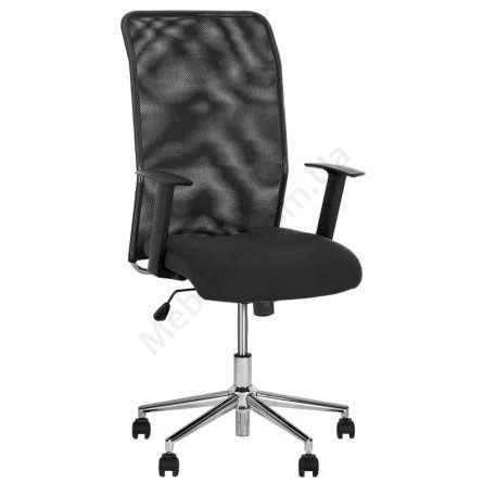 Операторське крісло з високою дихаючою спинкою, регульованими пластиковими підлокітниками, фіксацією у вертикальному положенні, на хромованій основі.