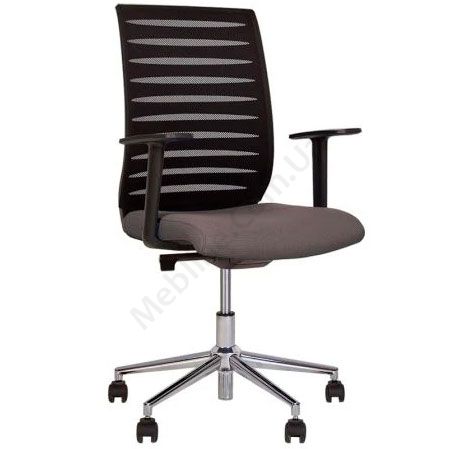 Стильне операторське крісло з дихаючою спинкою, нерегульованими пластиковими підлокітниками, фіксацією у 3 положеннях, на хромованій основі.