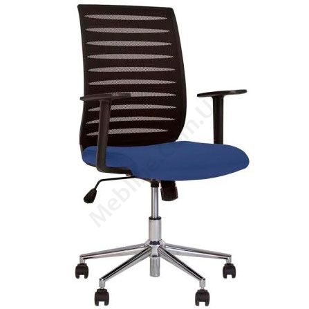 Стильне операторське крісло з дихаючою спинкою, нерегульованими пластиковими підлокітниками, фіксацією у вертикальному положенні, на хромованій основі.