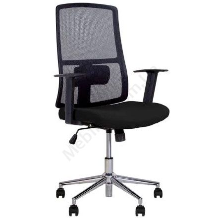 Сучасне операторське крісло з дихаючою спинкою, нерегульованими пластиковими підлокітниками, фіксацією у вертикальному положенні, на хромованій основі.
