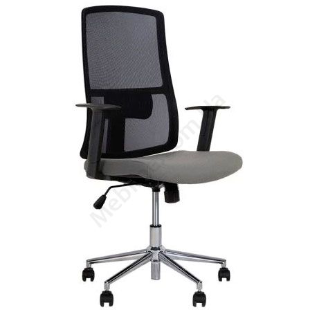 Комп’ютерне крісло з дихаючою спинкою, регульованими пластиковими підлокітниками, фіксацією у вертикальному положенні, на хромованій основі.