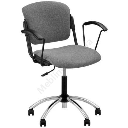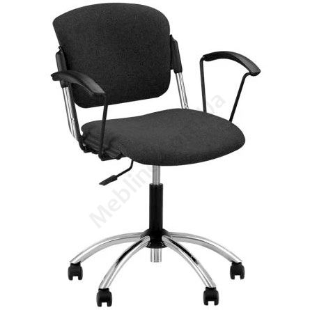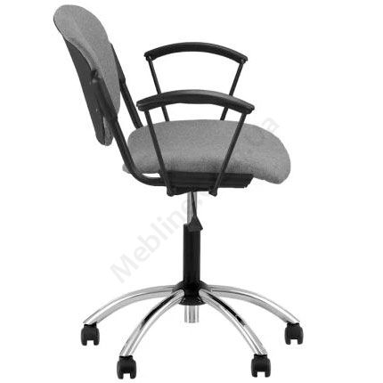 Поворотне крісло для роботи за комп’ютером з чорними підлокітниками на хромованій основі.