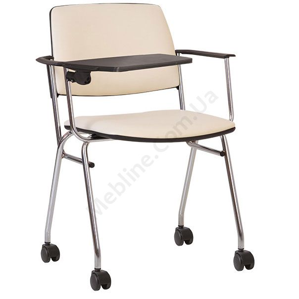 Стілець для конференцій з підлокітниками та столиком на роликах з хромованою рамою.