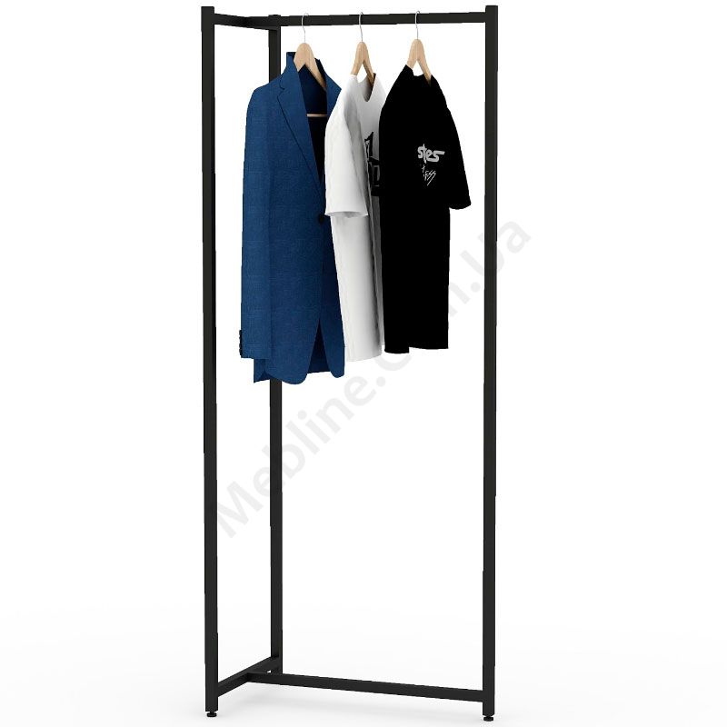 Виготовлена з фарбованого металу.Металева труба 20х20 мм, товщина стінок 1,5 мм.Дві штанги, розміщені у вигляді кута.Зручна для розміщення одягу на плічках.Підійде для приміщень у стилі лофт.