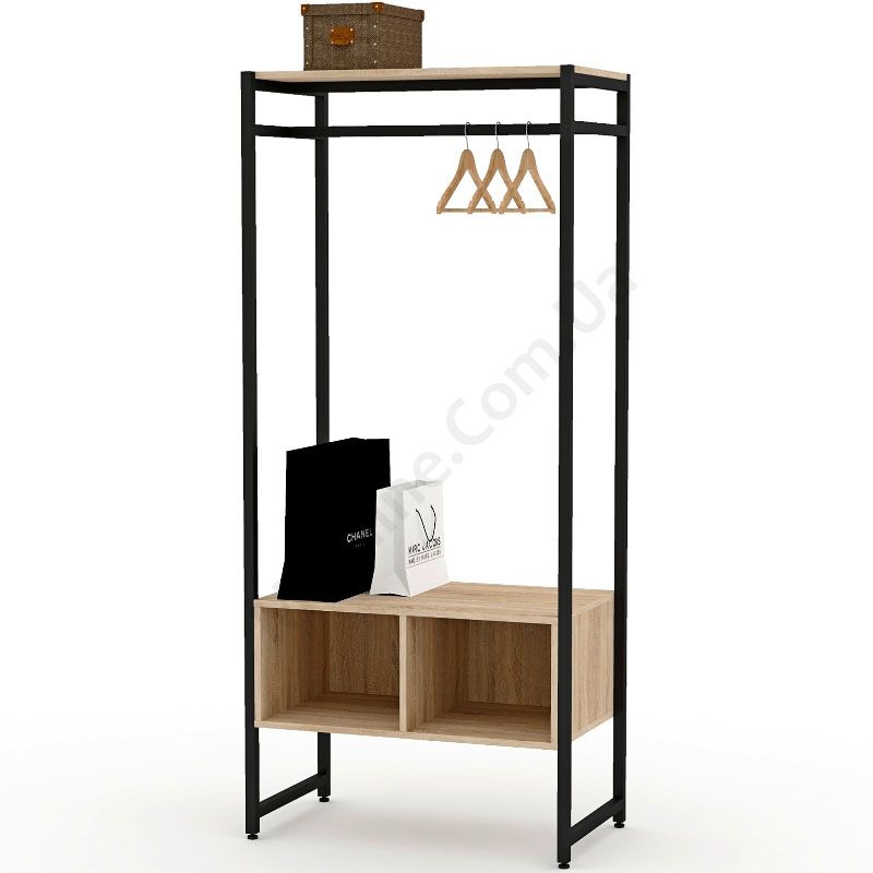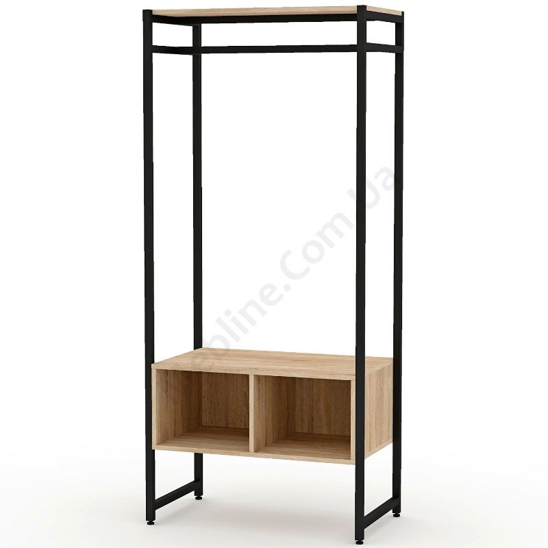 Виготовлена з фарбованого металу.Металева труба 20х20 мм, товщина стінок 1,5 мм.Полиці виготовлені з ДСП.Зручна для розміщення одягу на плічках.Зверху полиця для головних уборів.Знизу дві відкриті секції для взуття та інших речей.Підійде для приміщень у стилі лофт.
