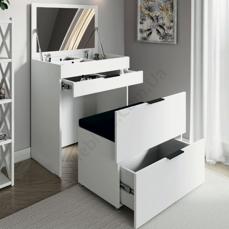 Розкладний туалетний столик у вигляді комода з дзеркалом та пуфом.