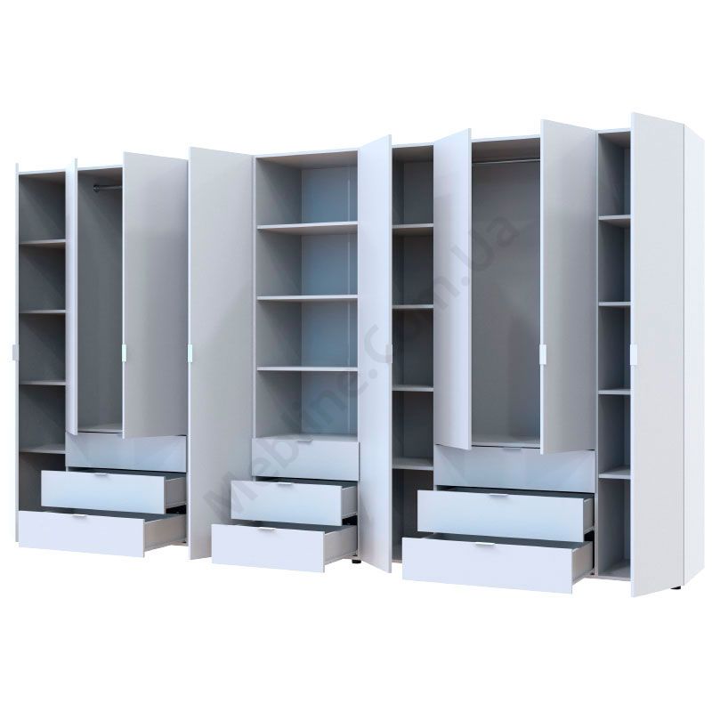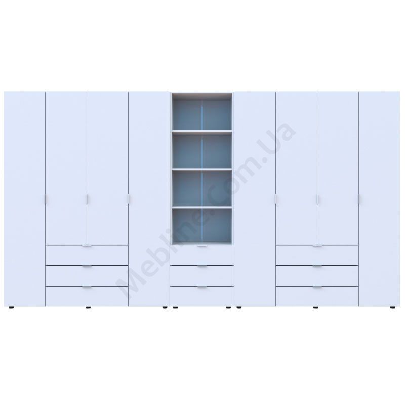 Дві чотиридверні шафи зі стелажем та висувними шухлядами.