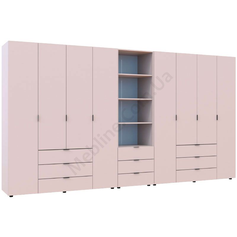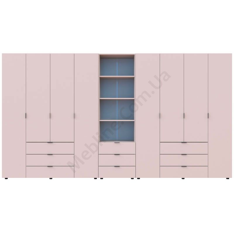 Дві чотиридверні шафи зі стелажем та висувними шухлядами.