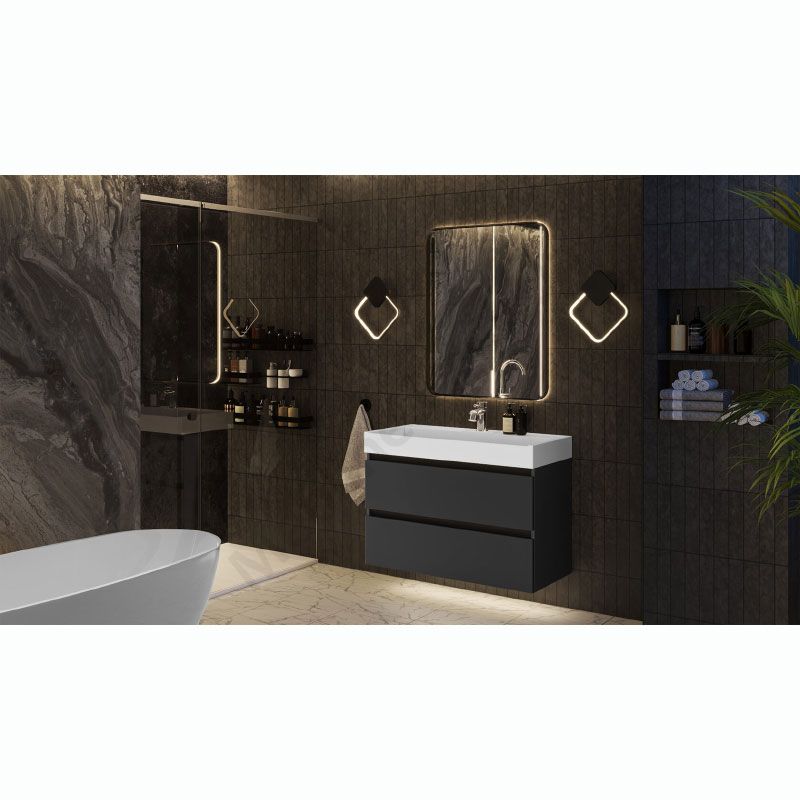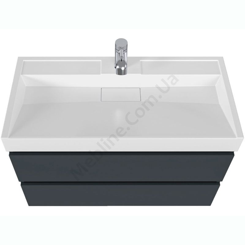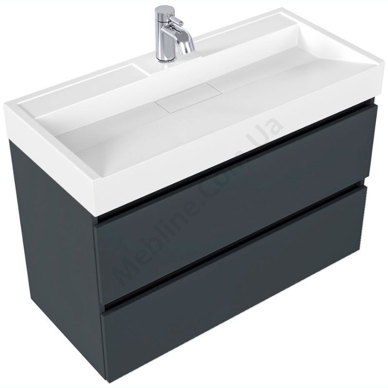 Навісна шафка для ванної з умивальником та двома висувними шухлядами.