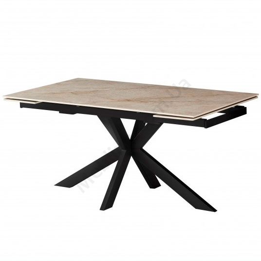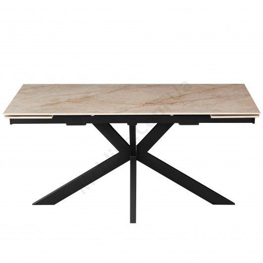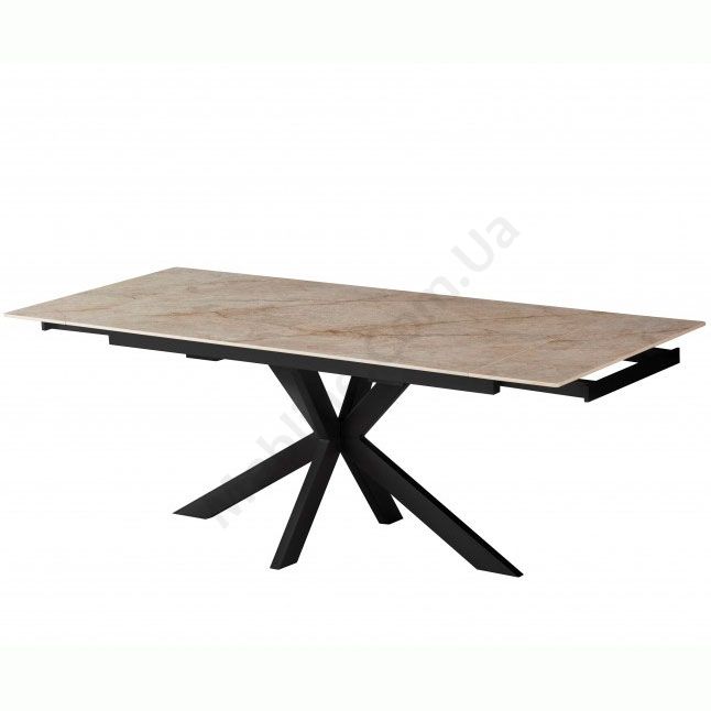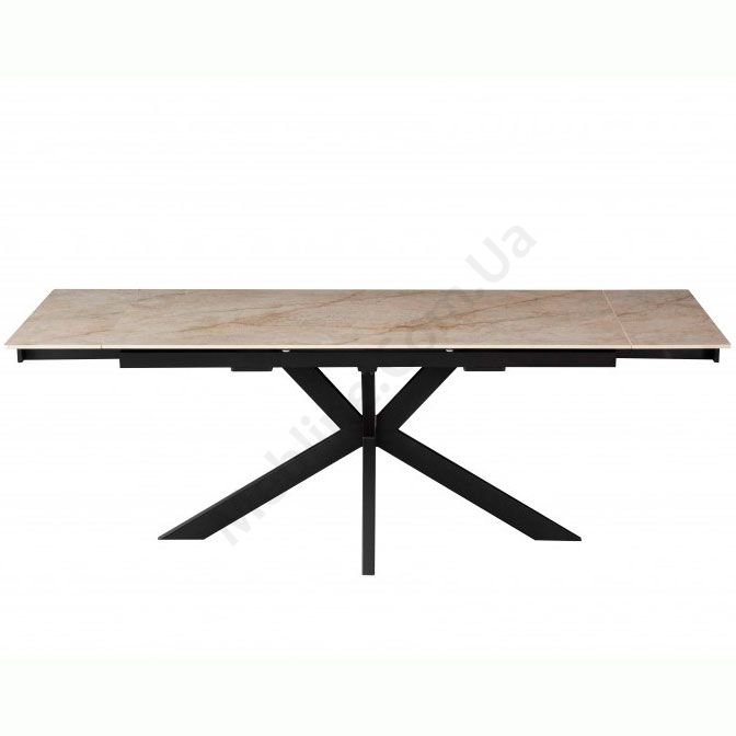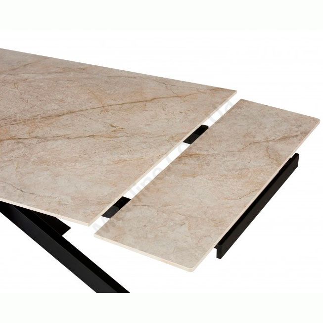 Розкладний обідній стіл на металевих ніжках з керамічною стільницею.