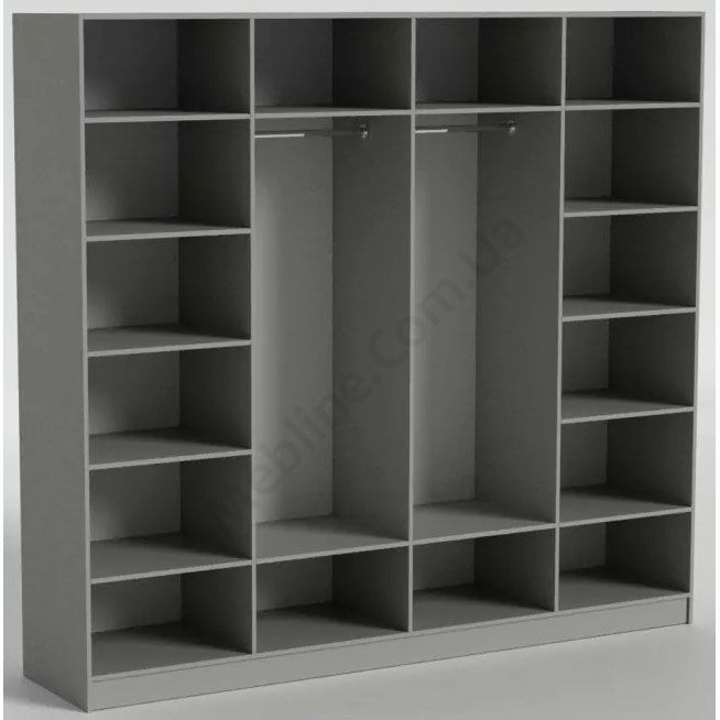 - За двома середніми дверцятами штанги для одягу та по дві полиці.