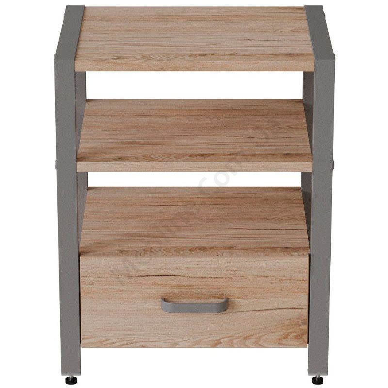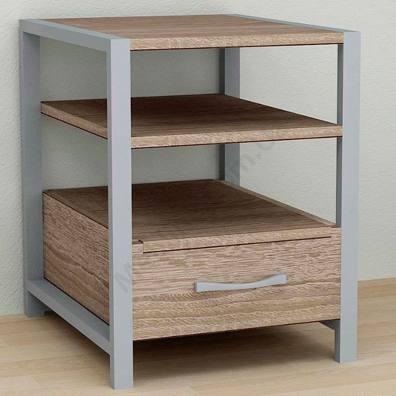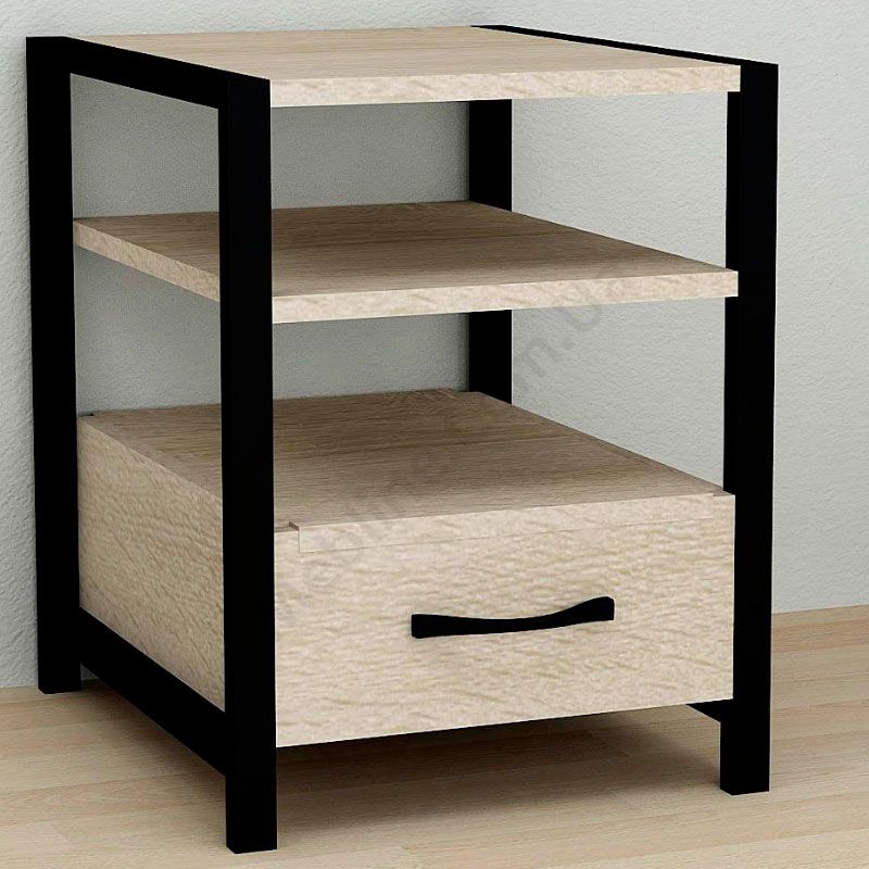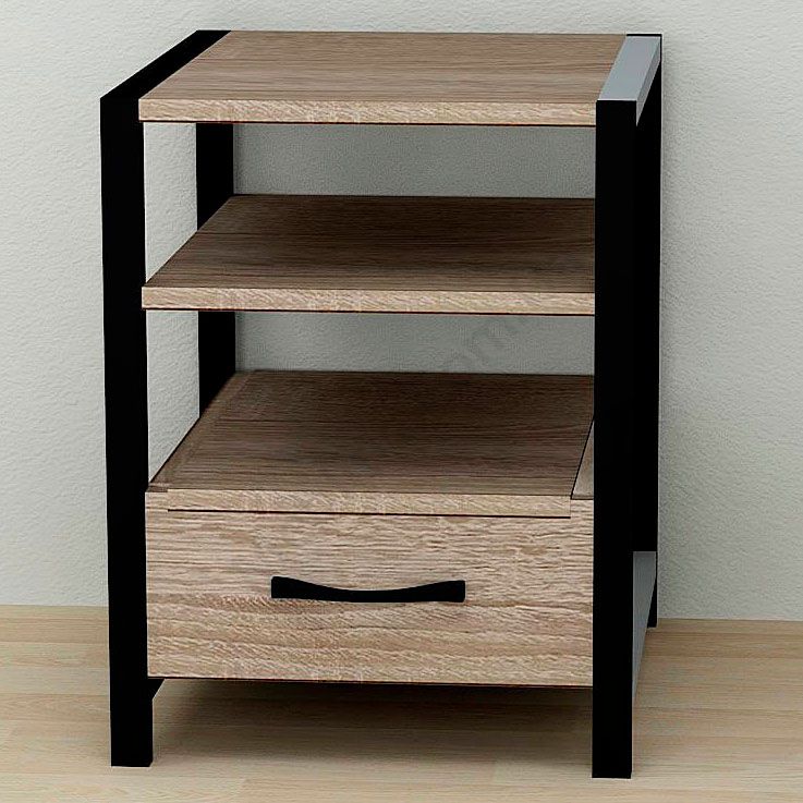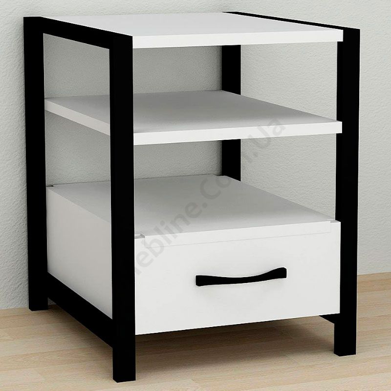 Тумба на металевих ніжках з висувною шухлядою та відкритими полицями.