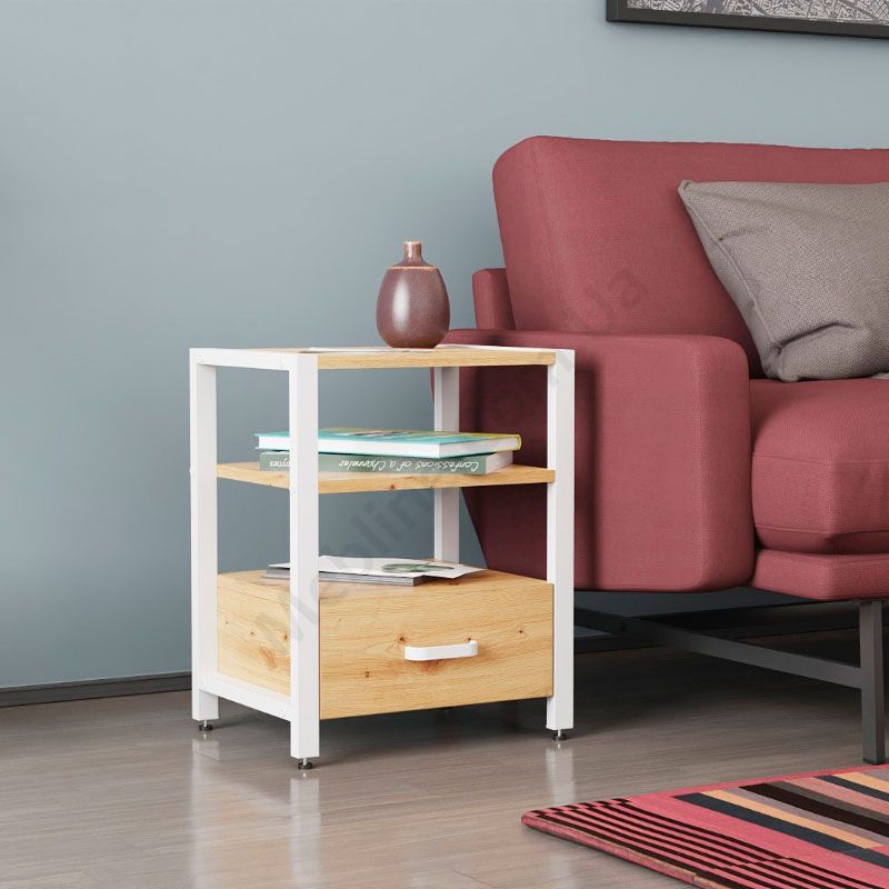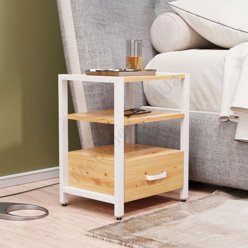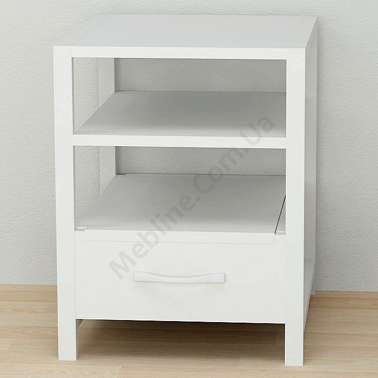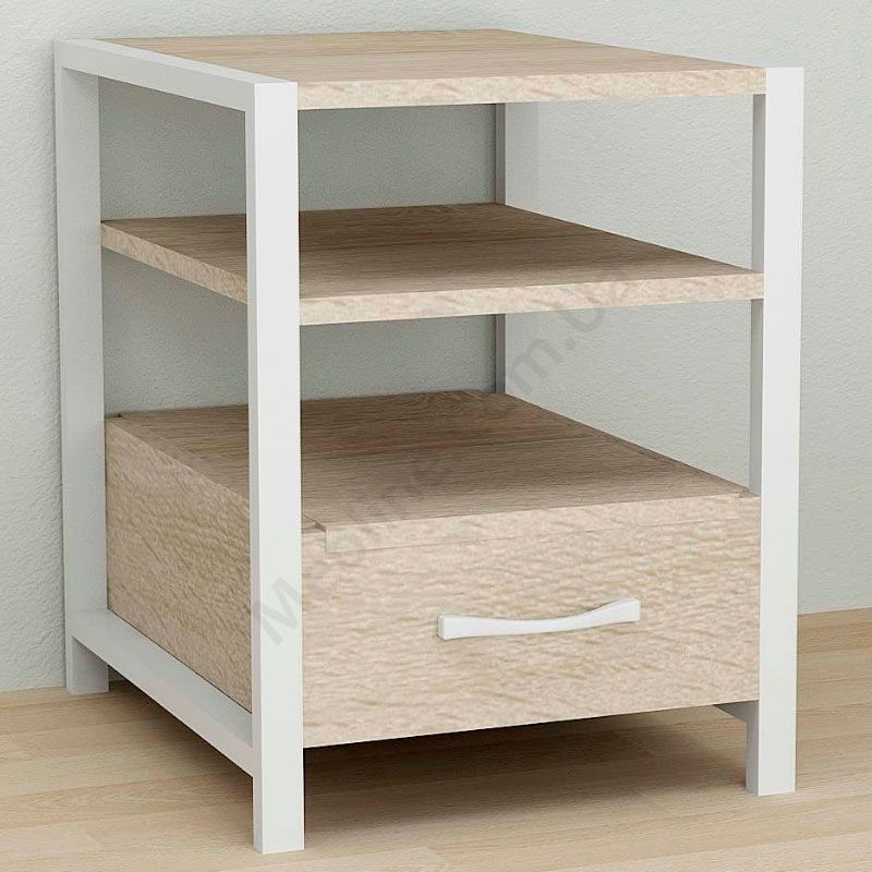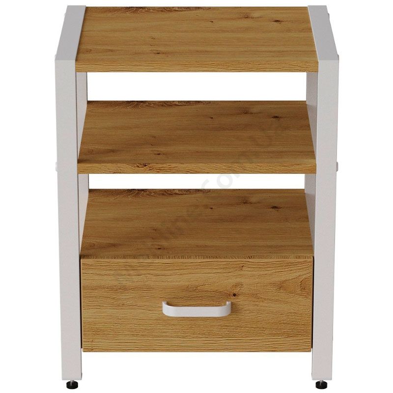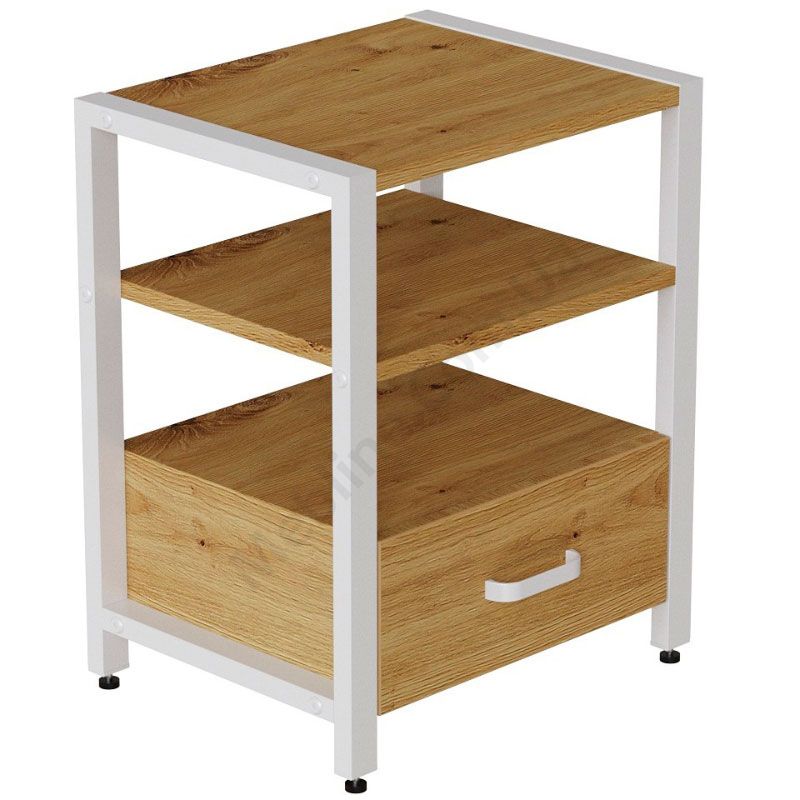 Тумба на металевих ніжках з висувною шухлядою та відкритими полицями.