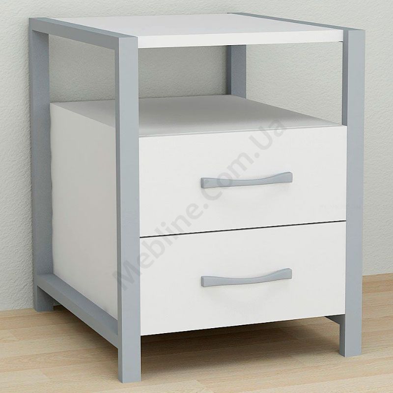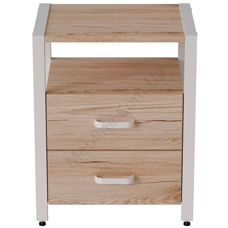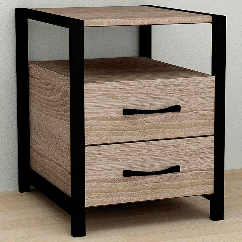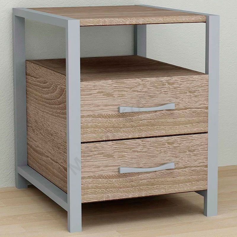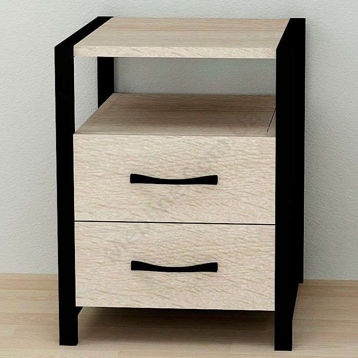 Тумба на металевих ніжках з висувними шухлядами та відкритою полицею.