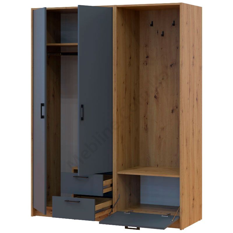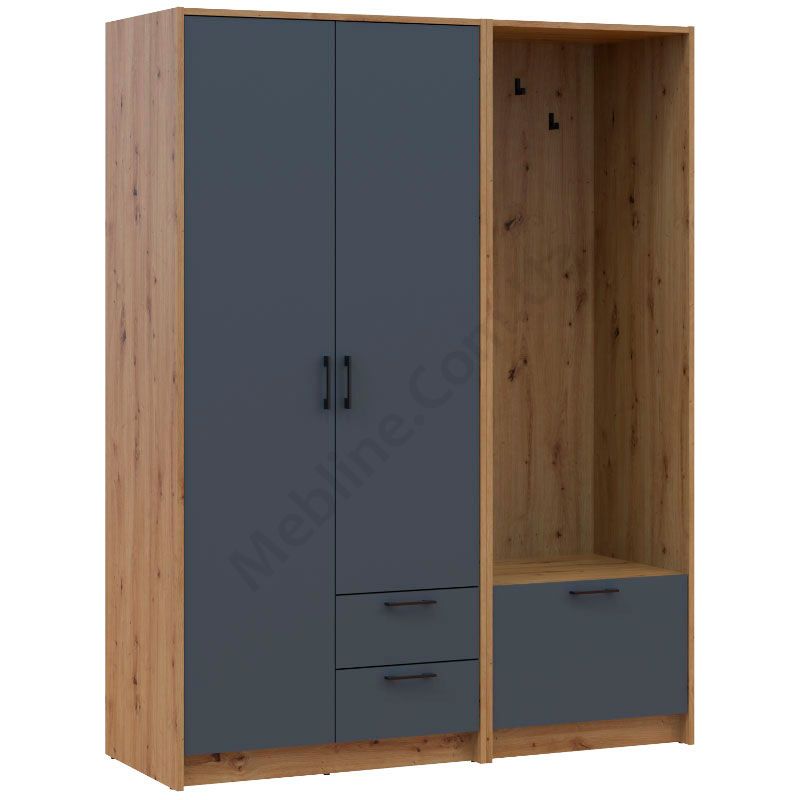 Розпашна дводверна шафа з вішаком, тумбою та висувними шухлядами.