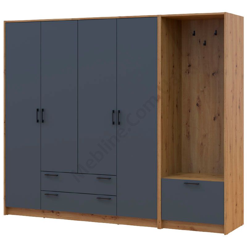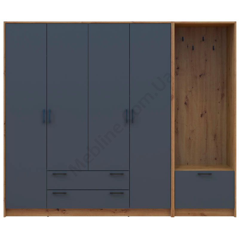 Розпашна чотиридверна шафа з вішаком, тумбою та висувними шухлядами.