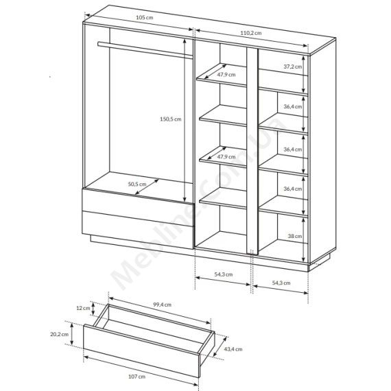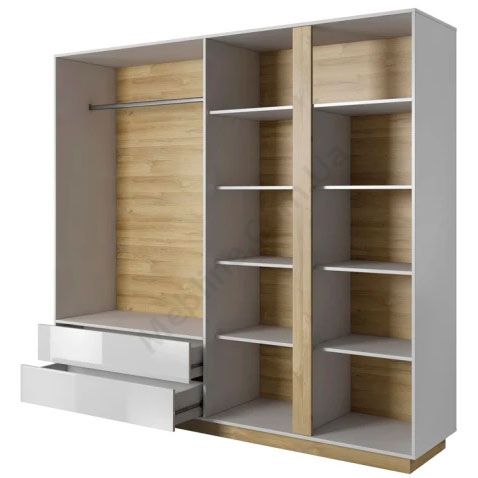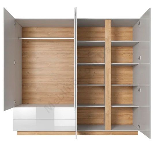 Чотиридверна шафа з висувними шухлядами, штангою та полицями всередині.