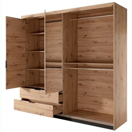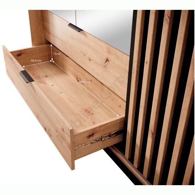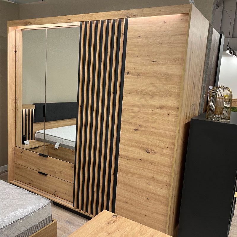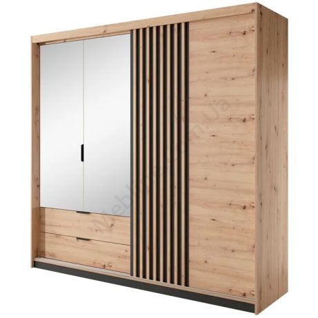 Тридверна шафа з розсувними та розпашними дверцятами, висувними шухлядами та дзеркалом.