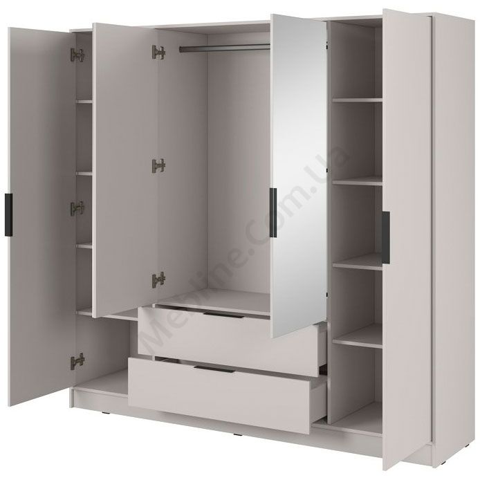 Чотиридверна шафа з шухлядами, дзеркалом, полицями та штангою.