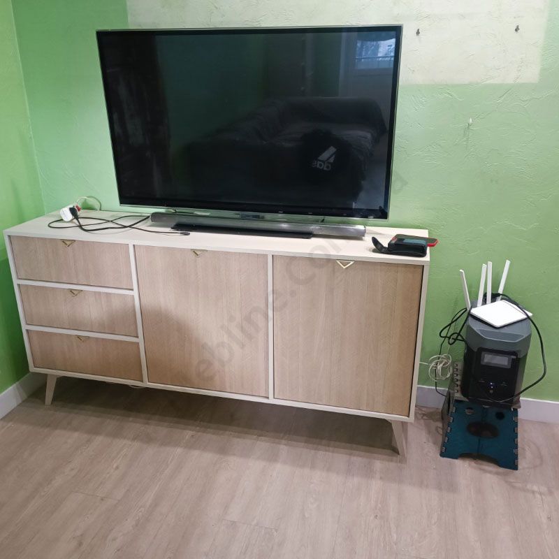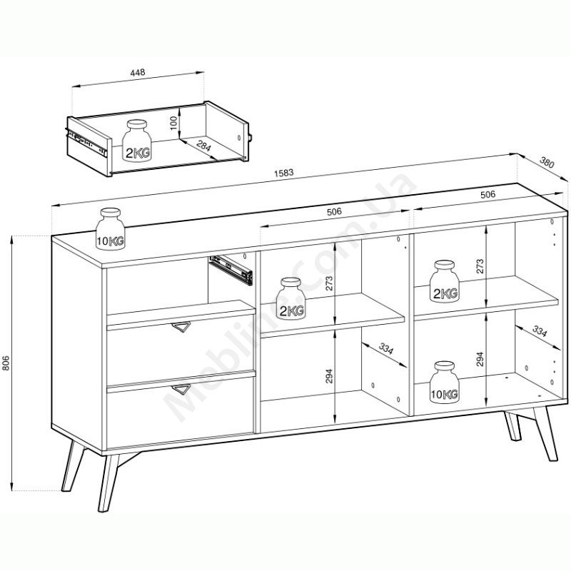 Тумба на ніжках з двома дверцятами та висувними шухлядами.