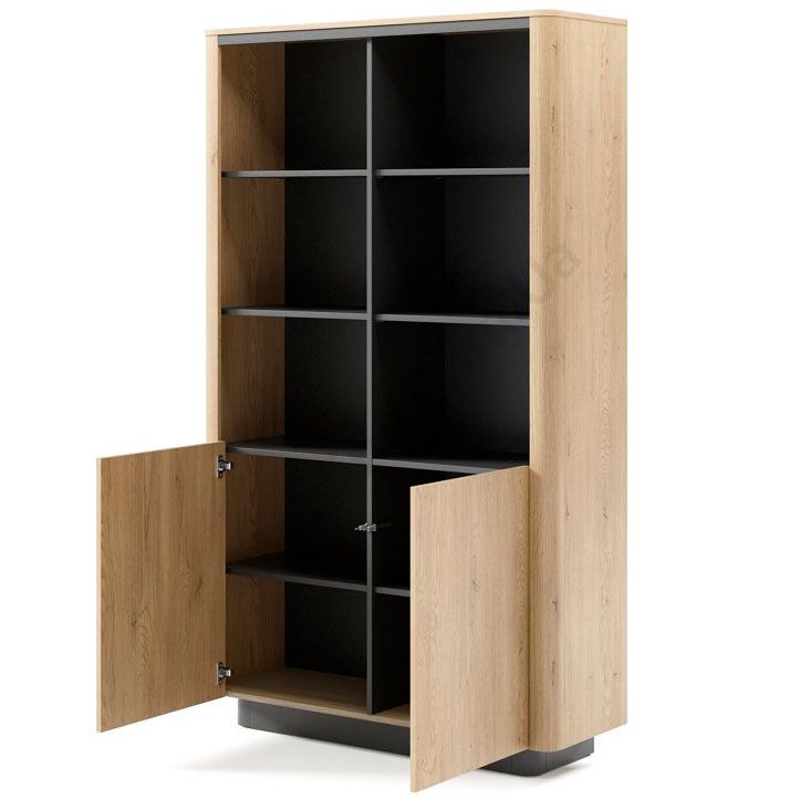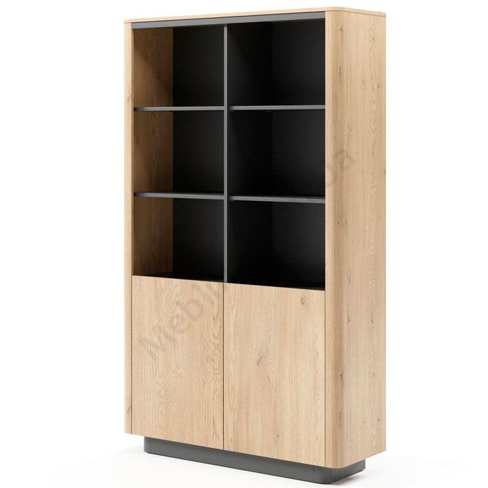 Стелаж з дверцятами та відкритими полицями.