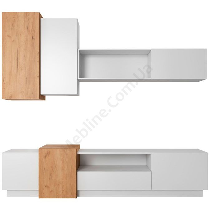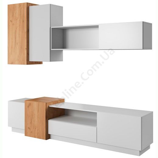 Стінка у вітальню з тумбою під телевізор, навісними шафками та полицею.