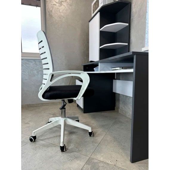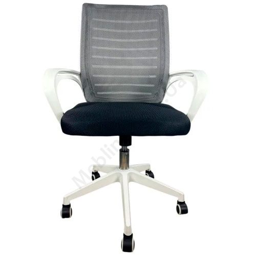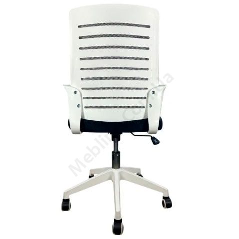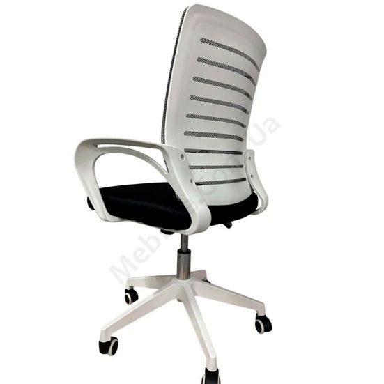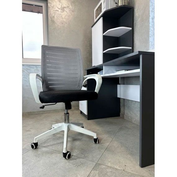 Комп’ютерне крісло з підлокітниками та сітчастою спинкою.