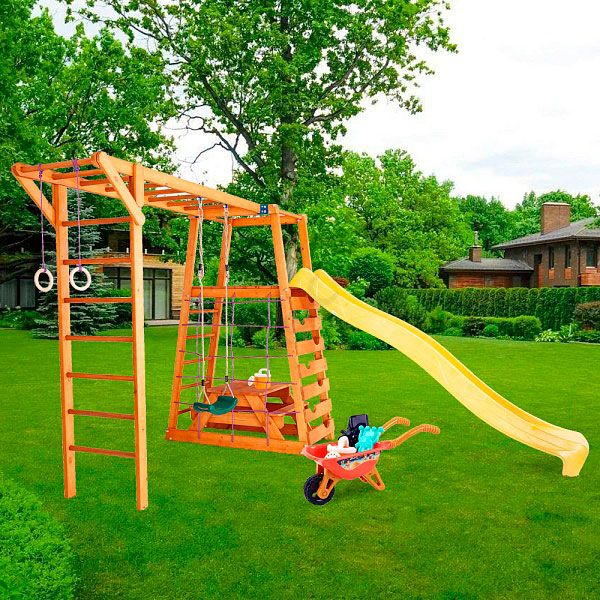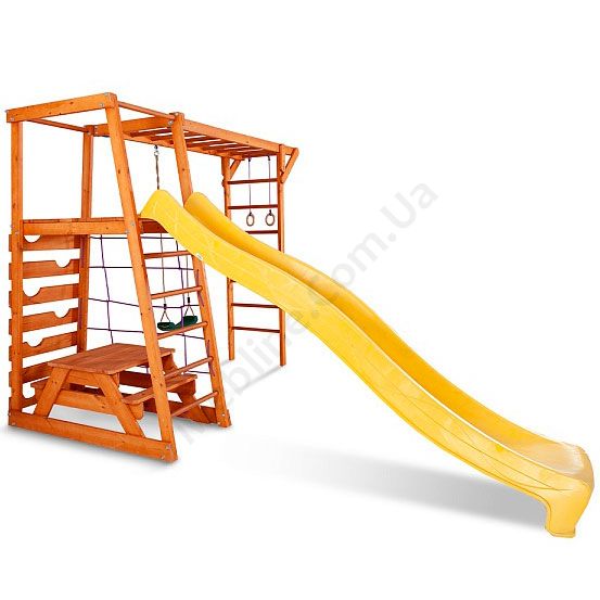 Дитячий ігровий комплекс з гіркою, гойдалкою та кільцями.