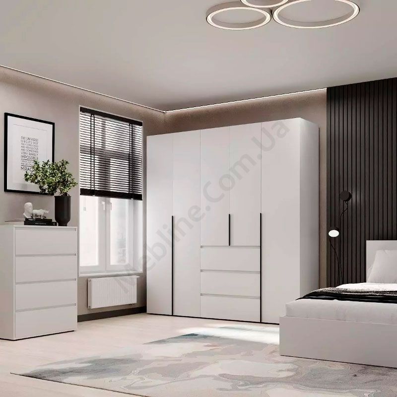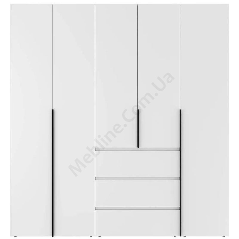 П’ятидверна шафа з висувними шухлядами, полицями та штангами для одягу.