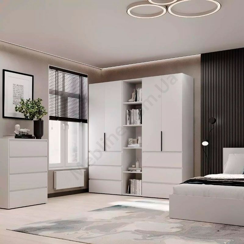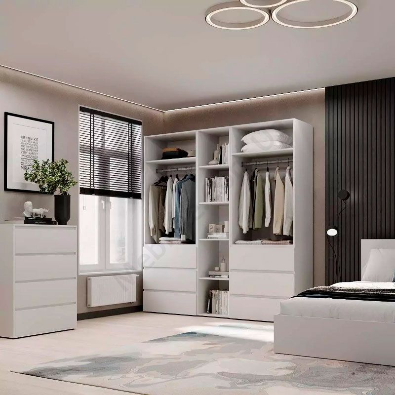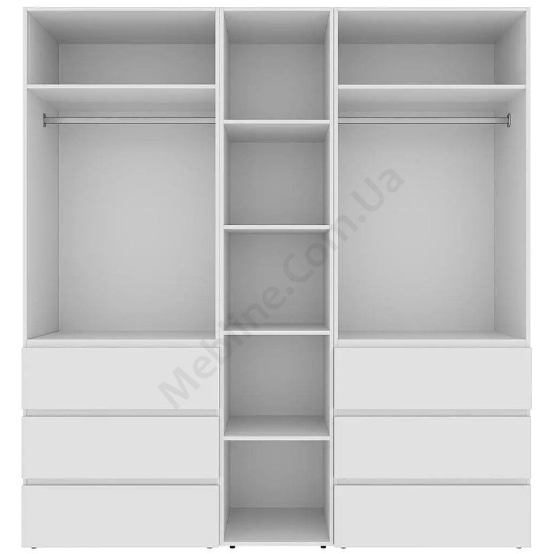 Чотиридверна шафа з висувними шухлядами, відкритими полицями та штангами для одягу.