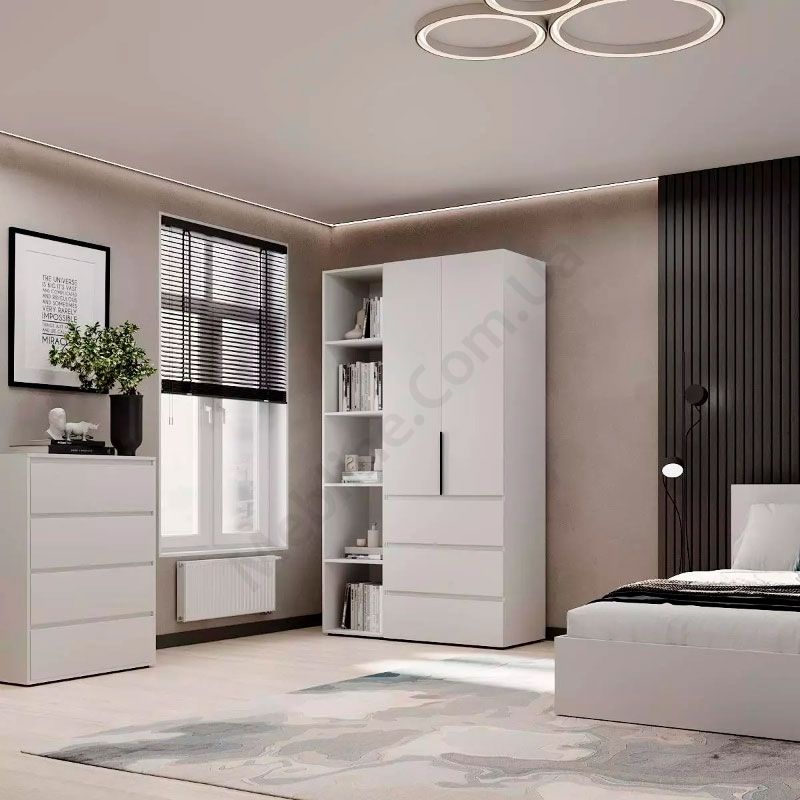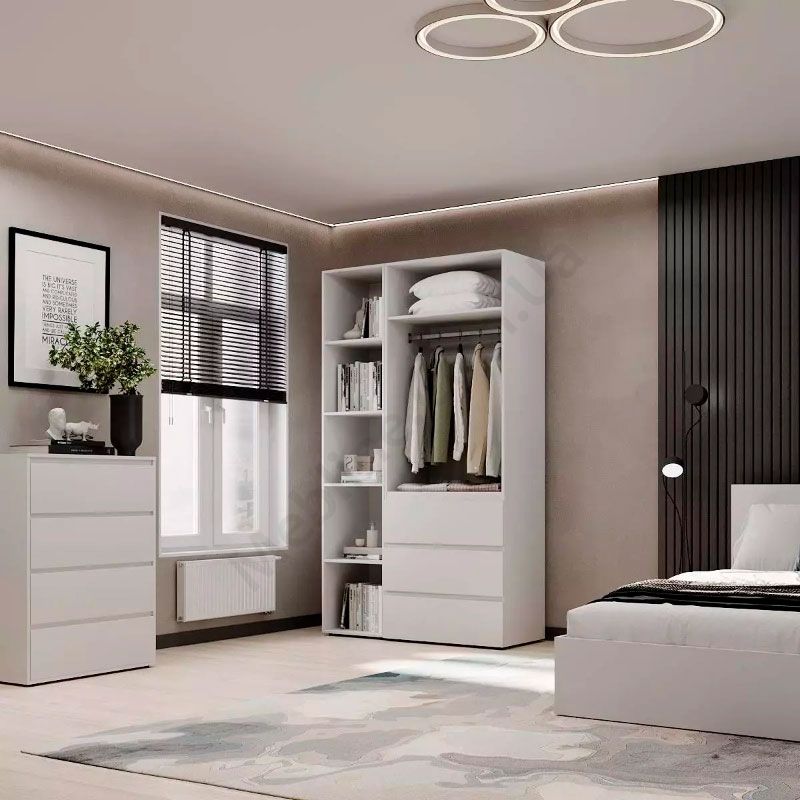 Дводверна шафа з відкритими полицями та висувними шухлядами.