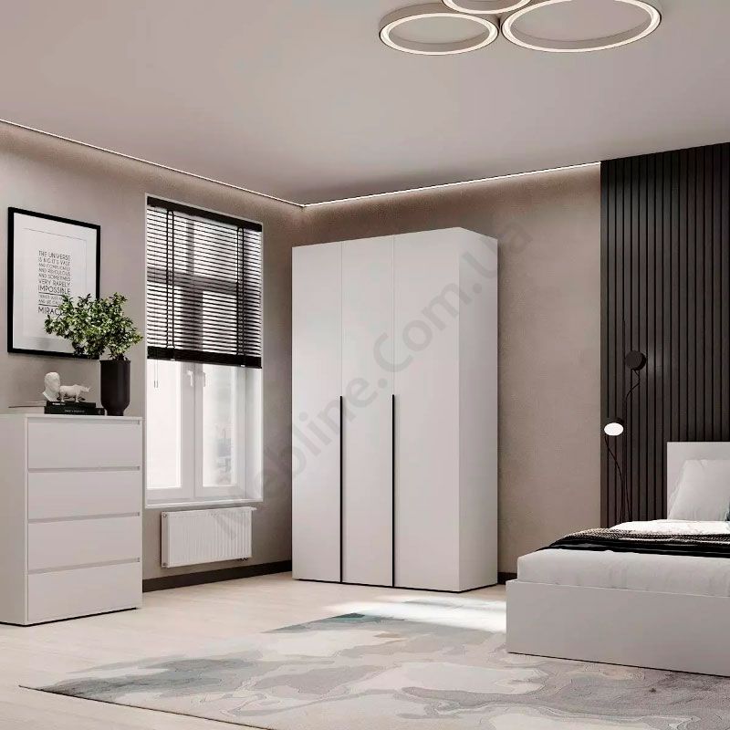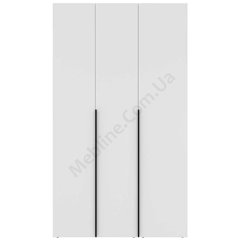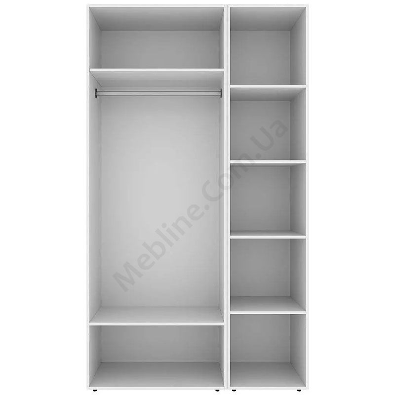Тридверна шафа зі штангою для одягу та полицями.