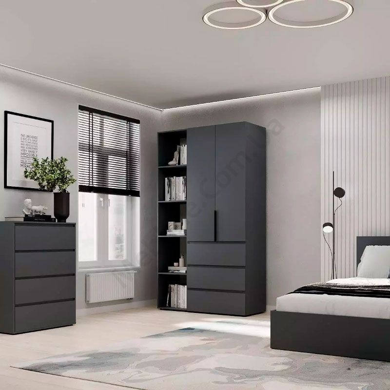 Дводверна шафа з відкритими полицями та висувними шухлядами.