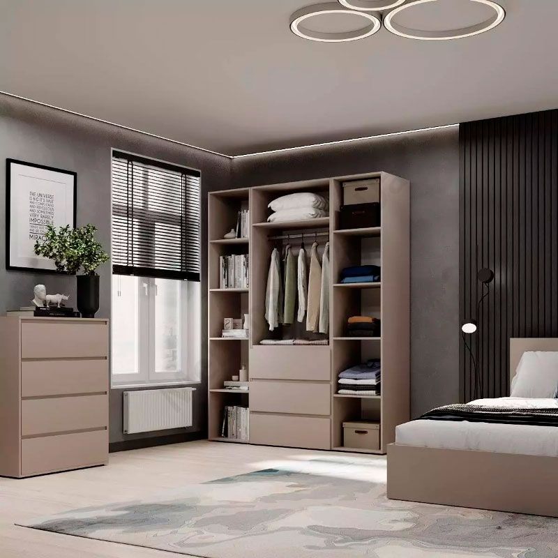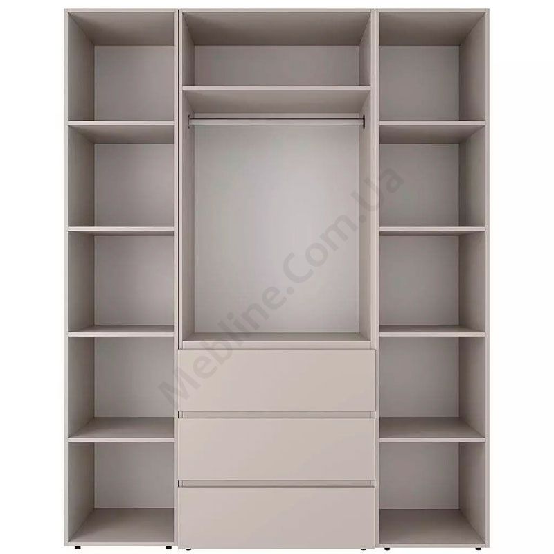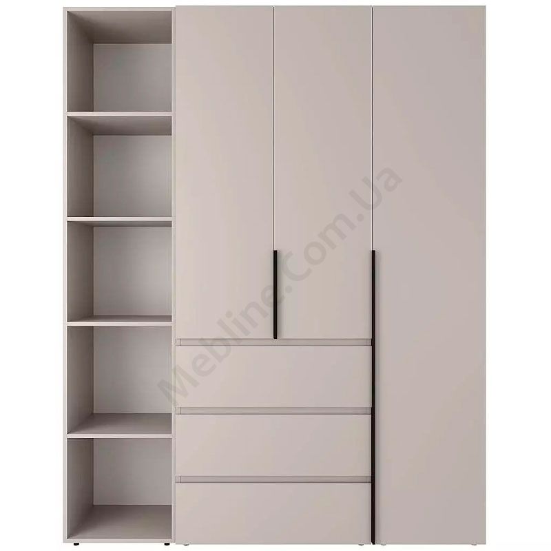 Тридверна шафа з відкритими полицями та висувними шухлядами.