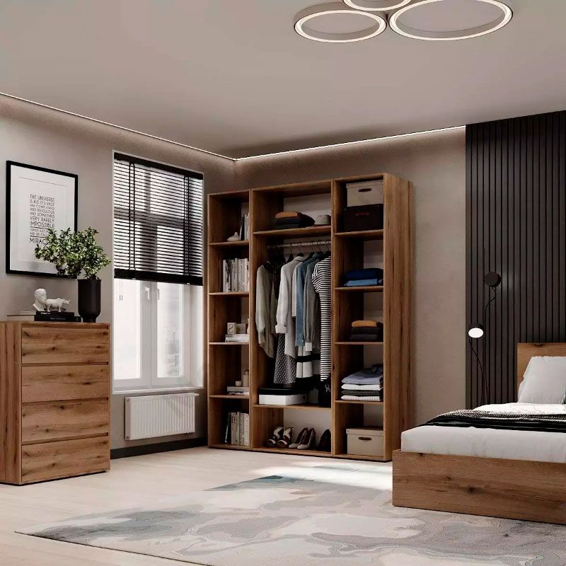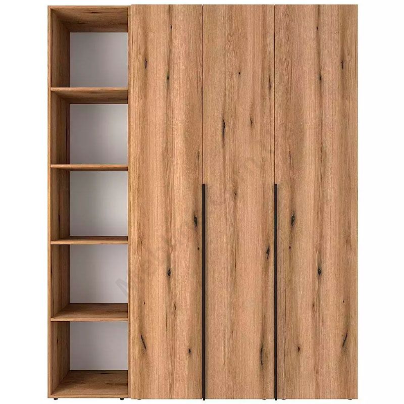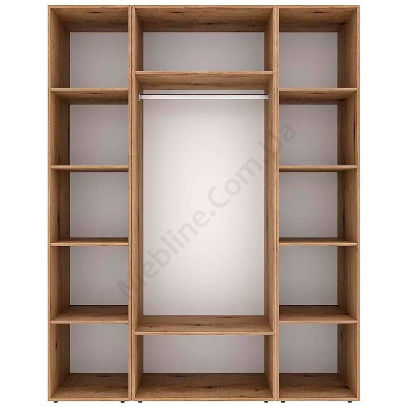 Тридверна шафа з відкритими полицями, штангою для одягу та полицями.