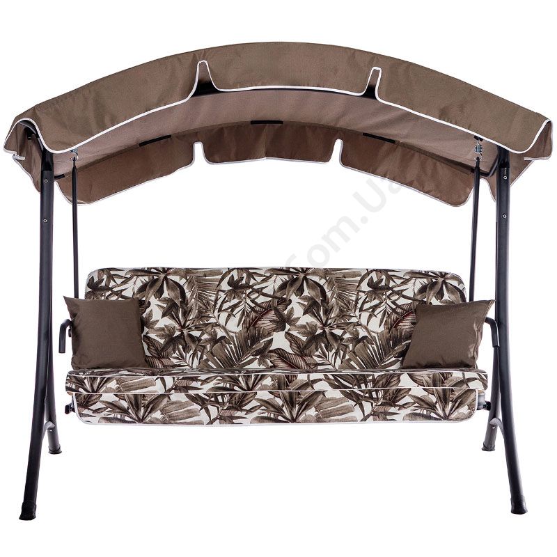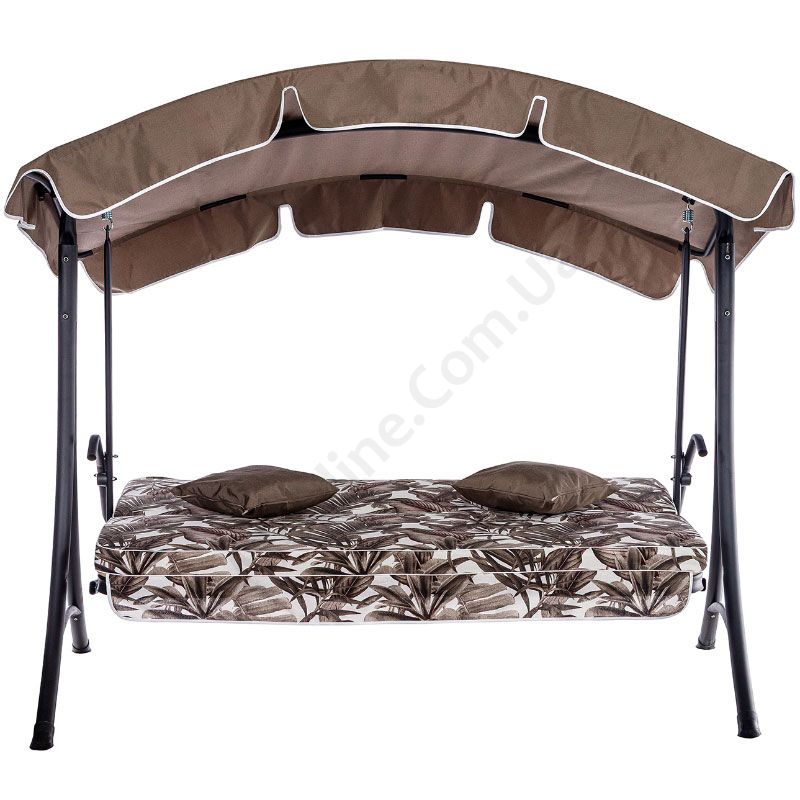 Гойдалка з розкладним диваном та тентом коричневого кольору з принтованим матрацом.