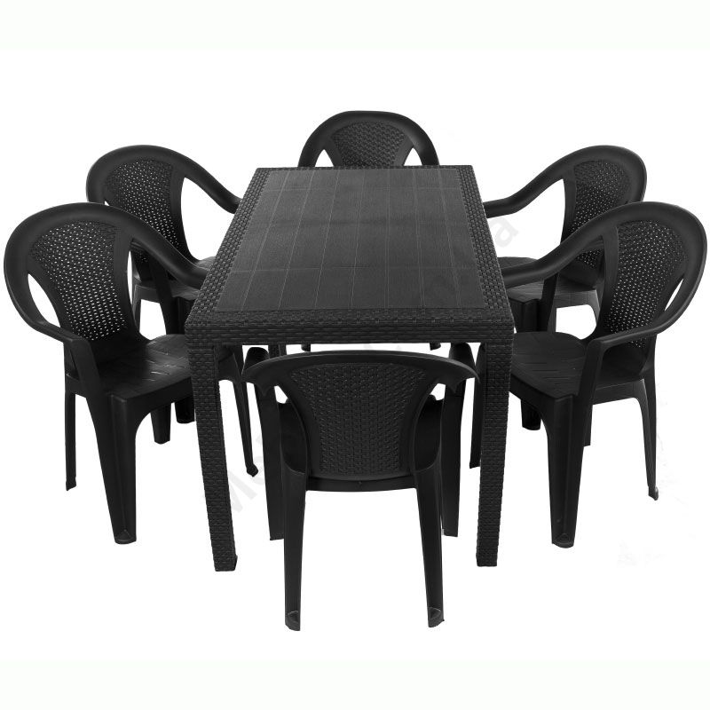 Набір пластикових меблів антрацитового кольору зі столом та шістьма стільцями.