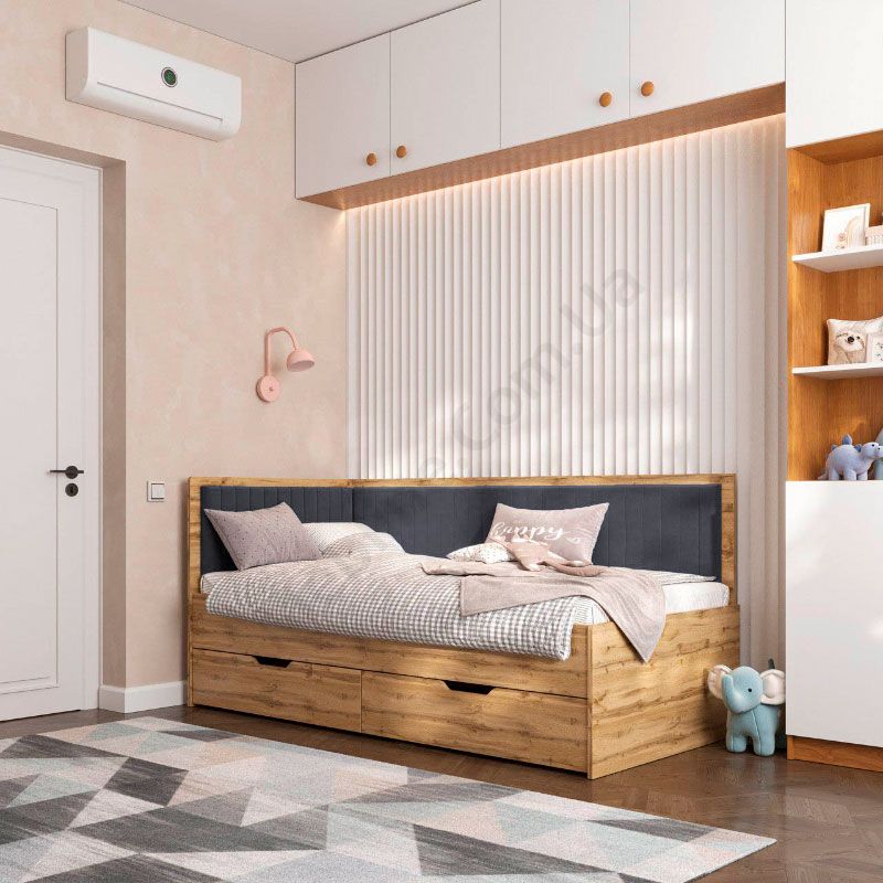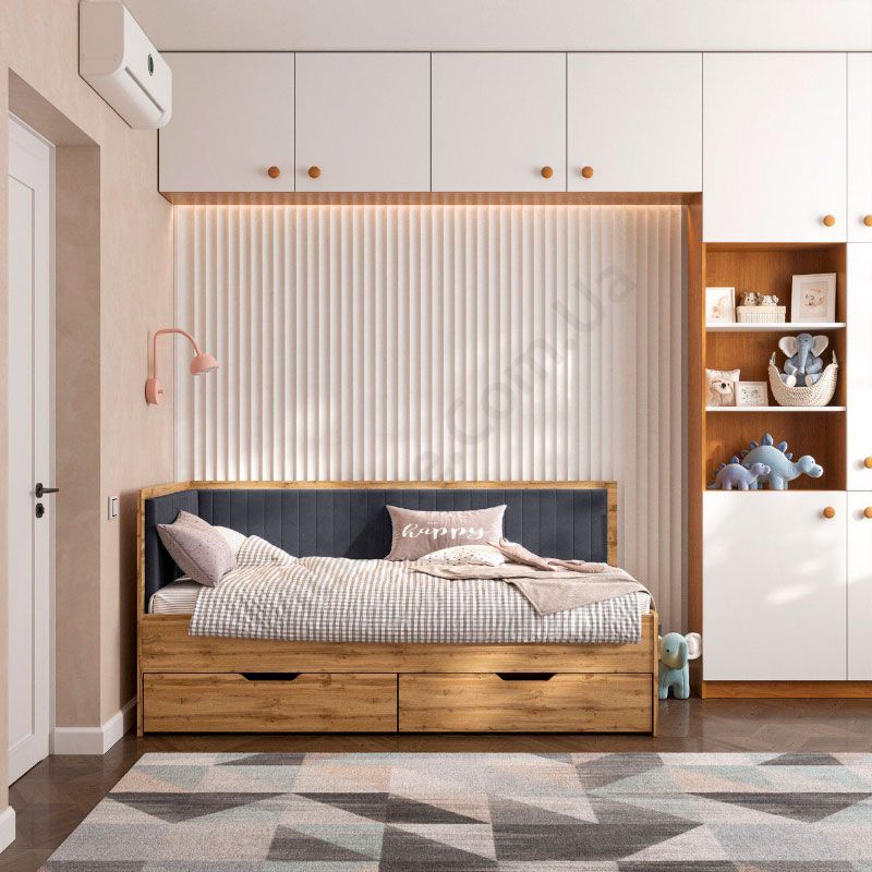 Дитяче ліжко софа з шухлядами для зберігання та м‘якою спинкою.