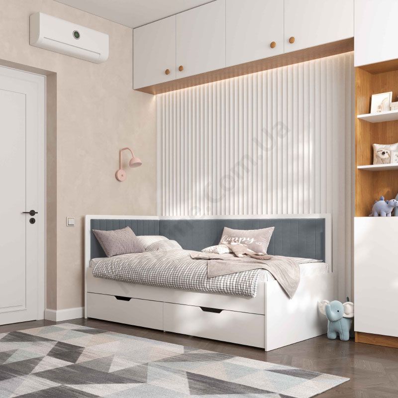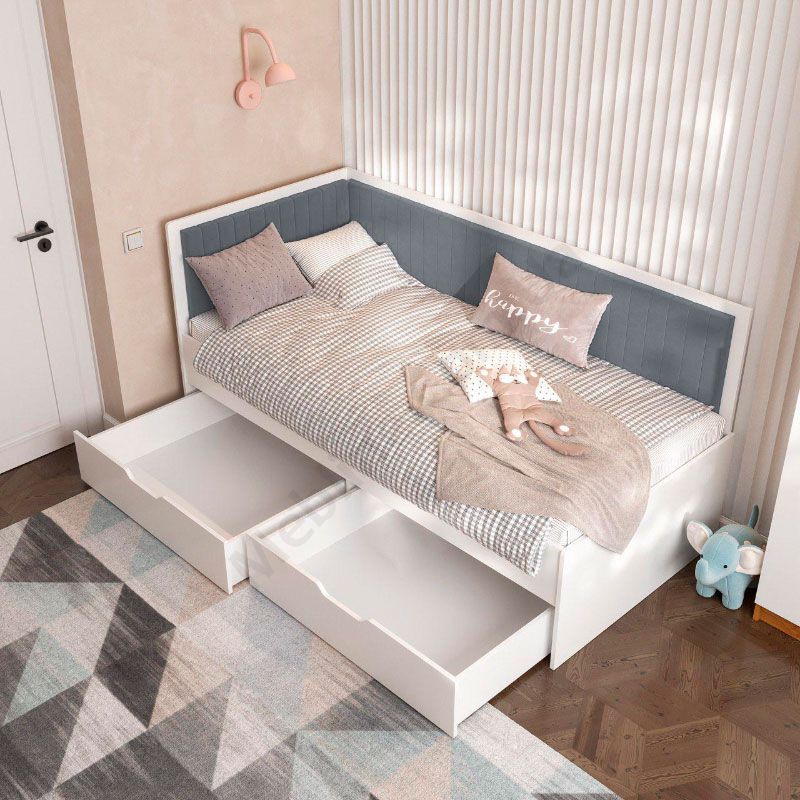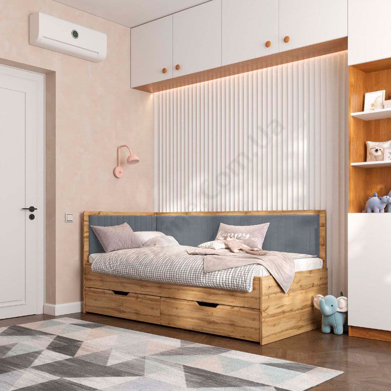 Дитяче ліжко софа з шухлядами для зберігання та м‘якою спинкою.