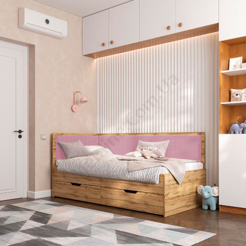 Дитяче ліжко софа з шухлядами для зберігання та м‘якою спинкою.