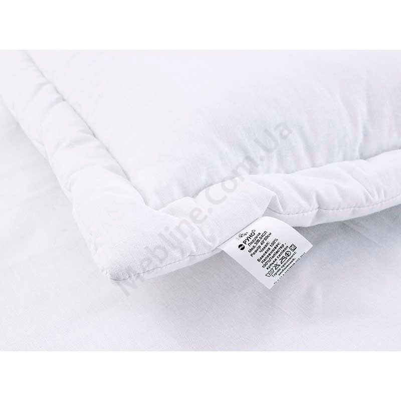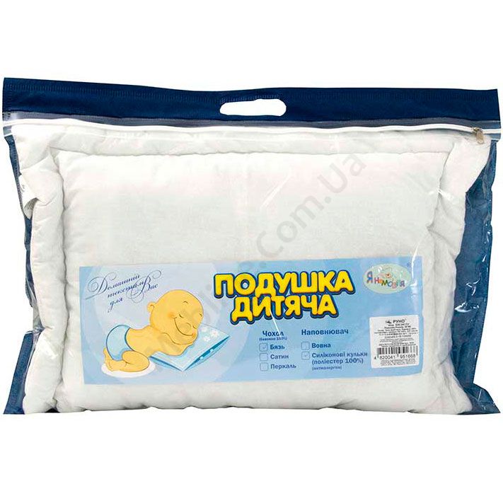 Дитяча подушка з незнімним чохлом з бязі, наповнена силіконізованими кульками.