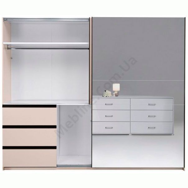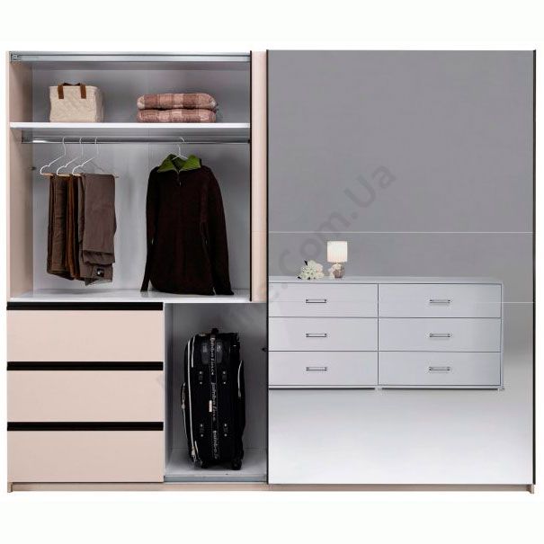 Дводверна шафа-купе з дзеркалом, висувними шухлядами та штангами для одягу.