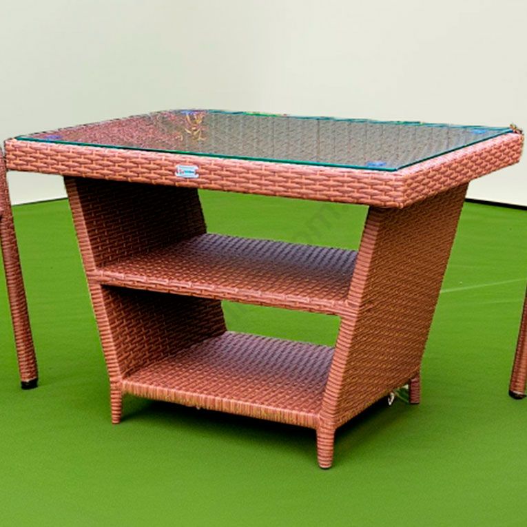 Плетений стіл зі штучного ротангу з прямокутною скляною стільницею.
