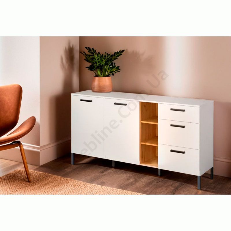 Комод з дверцятами, шухлядами та відкритими полицями.