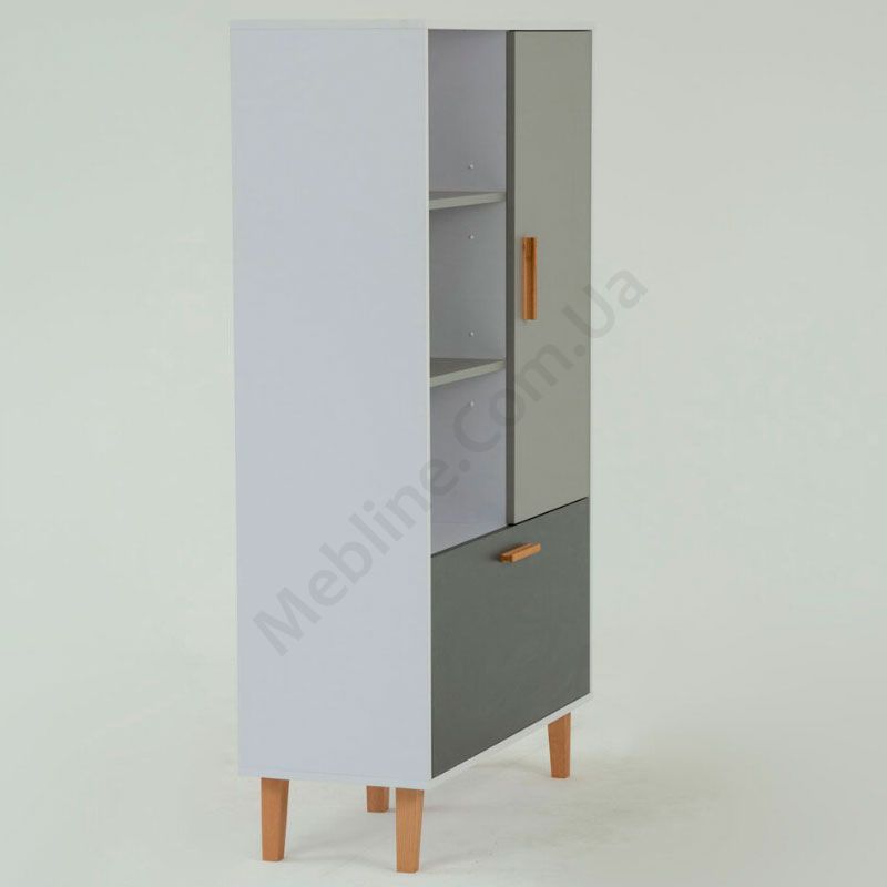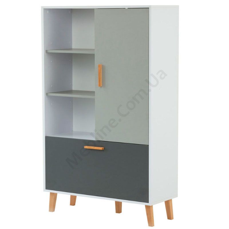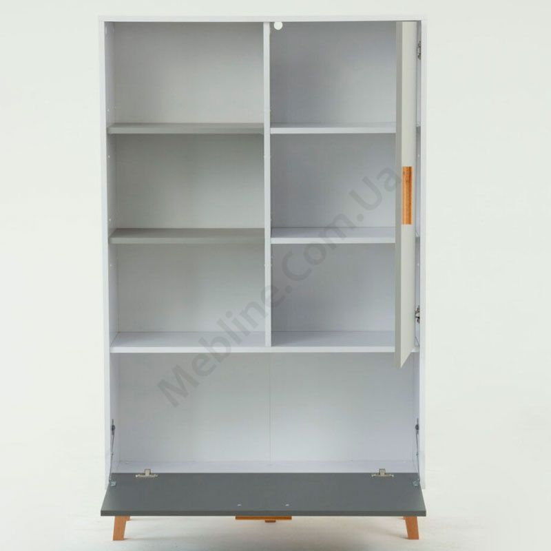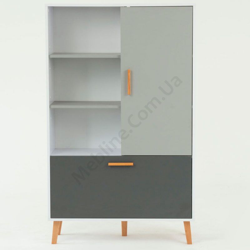 Стелаж на ніжках з відкритими полицями, відкидними та розпашними дверцятами.