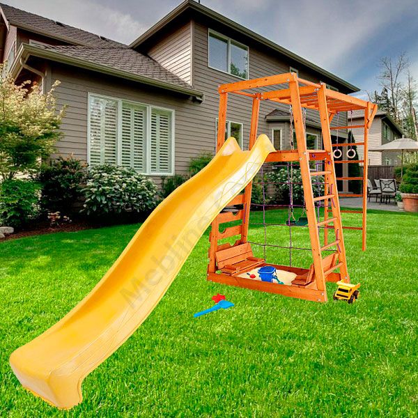 Дитячий ігровий комплекс з гіркою, гойдалкою та пісочницею.