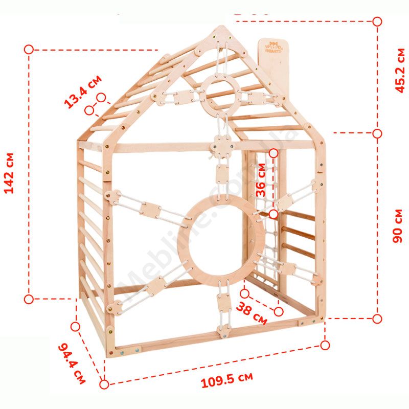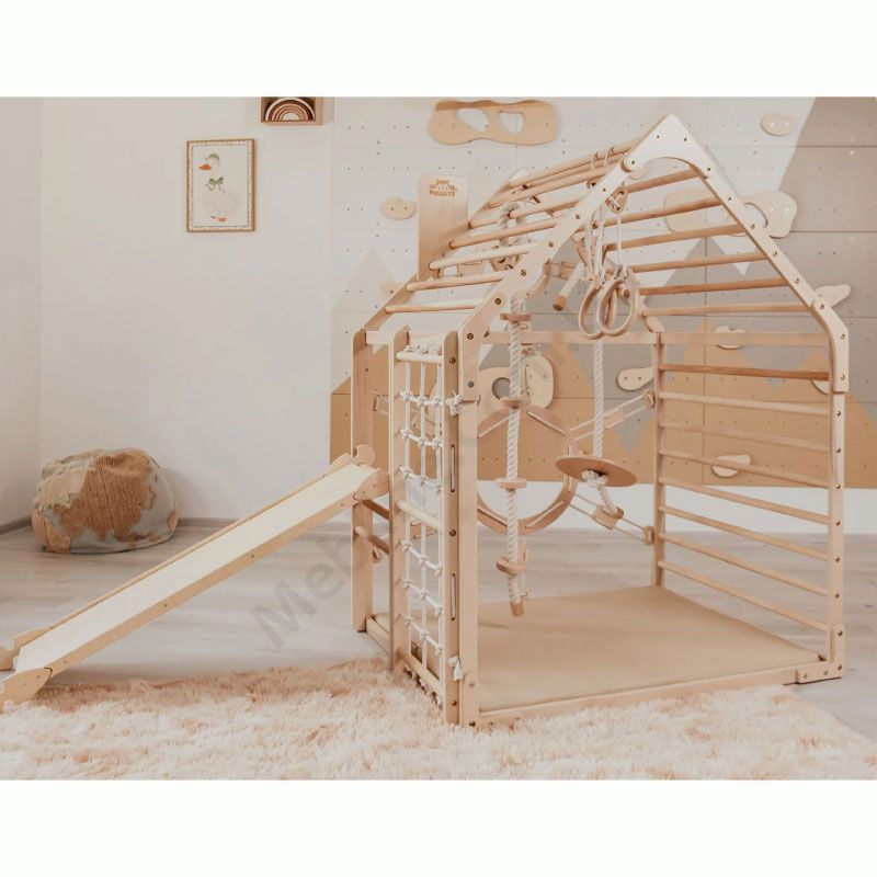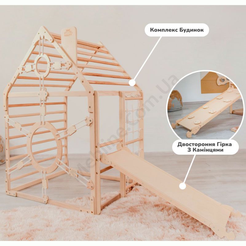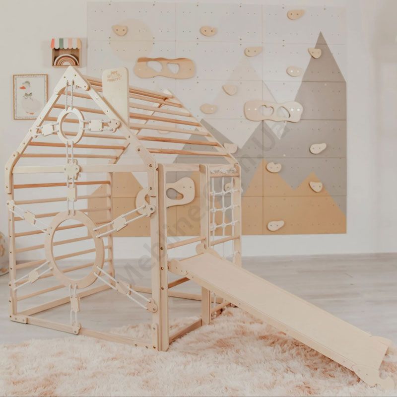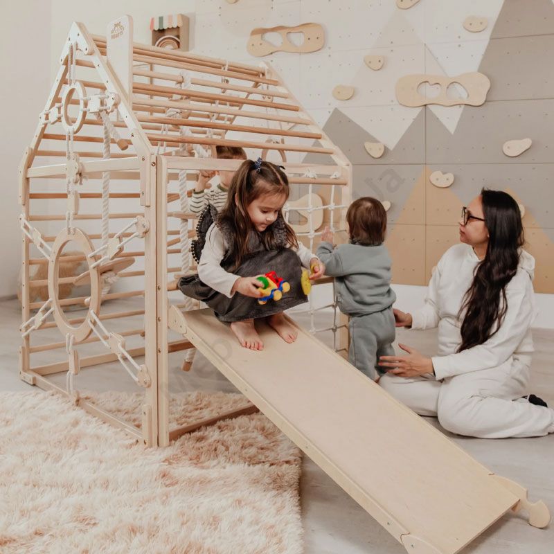 Дитячий дерев’яний комплекс для лазіння у вигляді будинка.